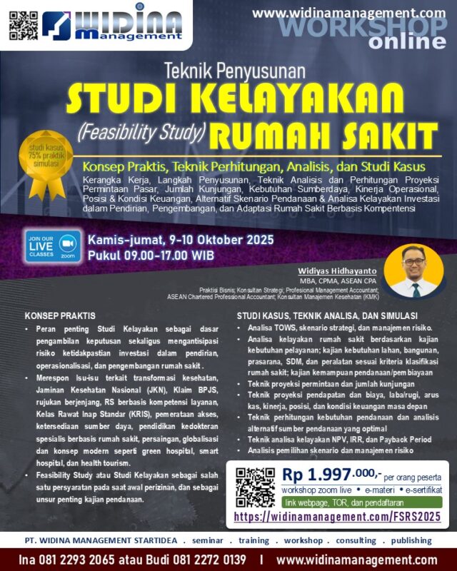 Workshop ini bertujuan memberikan pemahaman secara praktis mengenai teknik penyusunan studi kelayakan (feasibility study) rumah sakit mulai dari kerangka kerja, langkah penyusunan, teknik analisis, perhitungan proyeksi, kebutuhan sumberdaya, alternatif pendanaan, analisa kelayakan investasi, sampai dengan alternatif skenario yang mungkin dilakukan dalam pendirian dan pengembangan rumah sakit, terutama pada pendalaman teknis terkait proyeksi atau forecasting jumlah pelayanan, analisa kebutuhan investasi, proyeksi kondisi dan kinerja keuangan, perhitungan analisa kelayakan investasi, skenario analisa kinerja operasional, sampai dengan skenario pendanaan dan arus kas.