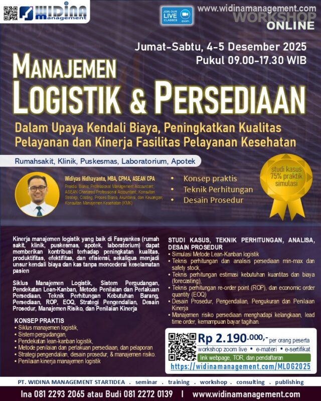 Workshop ini bertujuan memberikan pemahaman konsep praktis manajemen logistik di fasilitas pelayanan kesehatan terkait siklus manajemen logistik, sistem pergudangan, pendekatan lean-kanban logistik, metode penilaian dan perlakuan persediaan, strategi pengendalian, desain prosedur, manajemen risiko, dan penilaian kinerja manajemen logistik, serta ketrampilan teknis cara perhitungan dan analisis terkait persediaan min-max, safety stock, estimasi kebutuhan kuantitas dan biaya (forecasting), re-order point (ROP), dan economic order quantity (EOQ) terhadap masing-masing barang logistik.